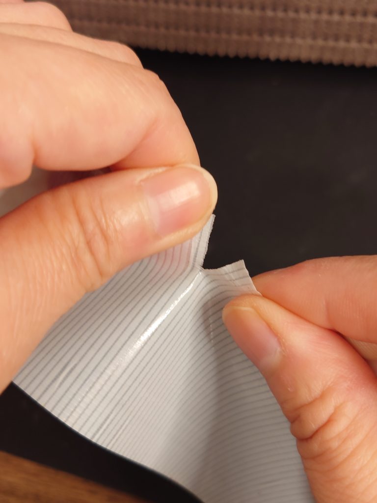 ノンスリップテープを剥がしてみました。ご覧の通り、糊残りのベタベタが全くありません。どんな作業にも安心して使えます。