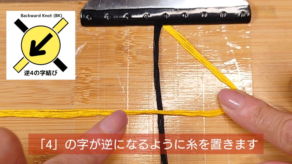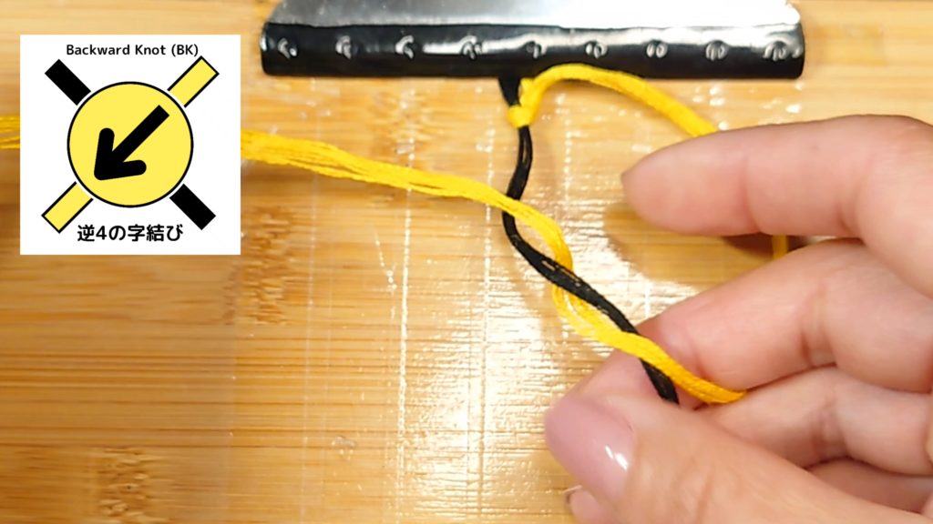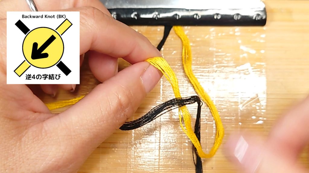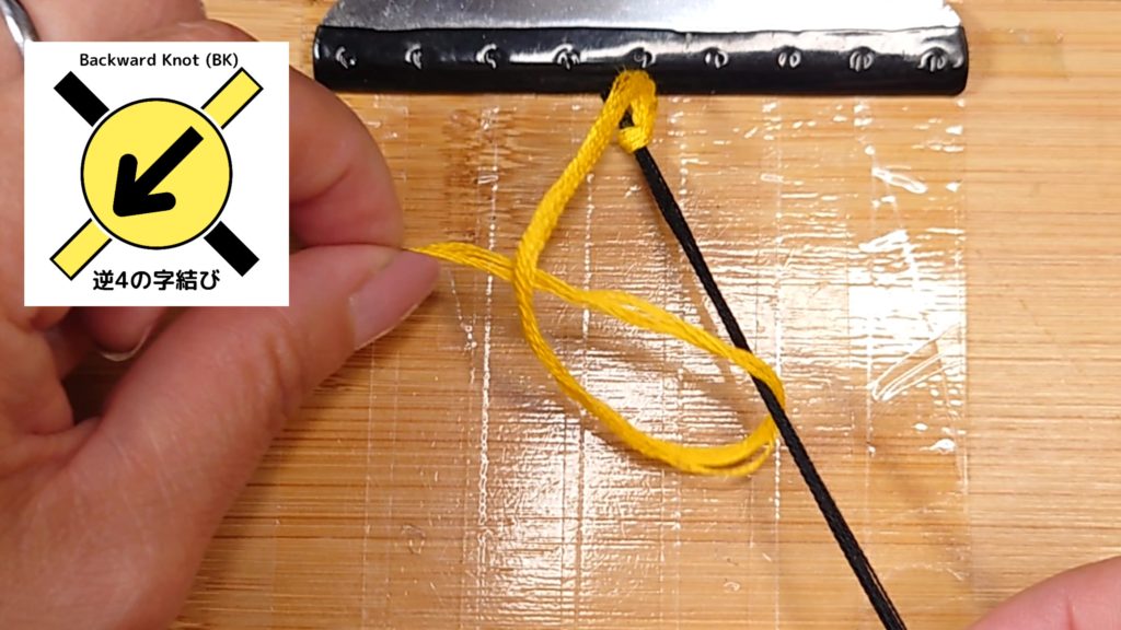 芯になる糸(黒)の上から下へ結び目を作る糸(黄色)を巻きつけ・・・