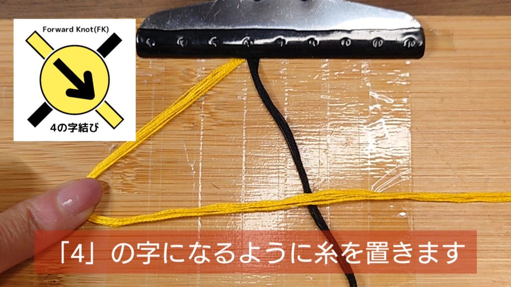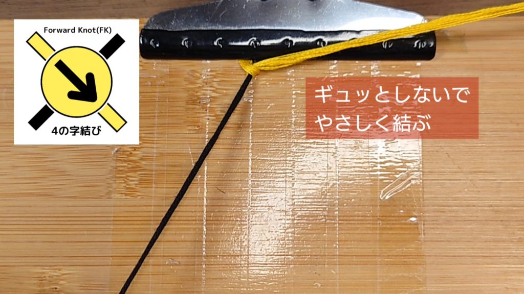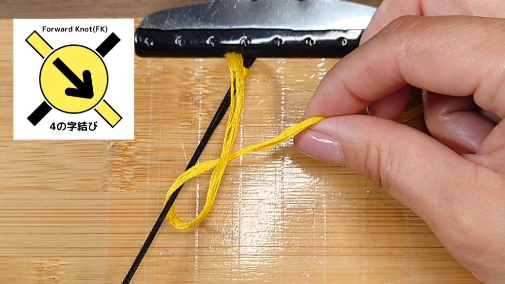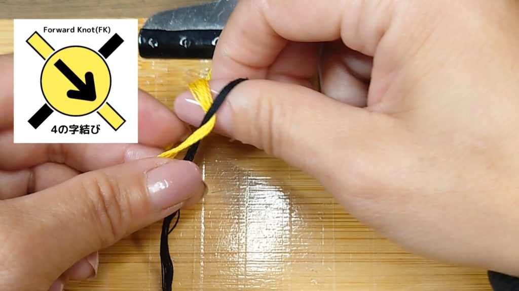結び目を作る糸(黄色)を右上に向けて引っ張ります。