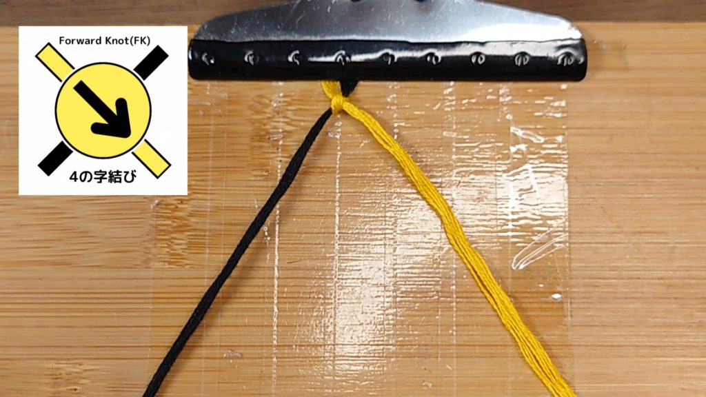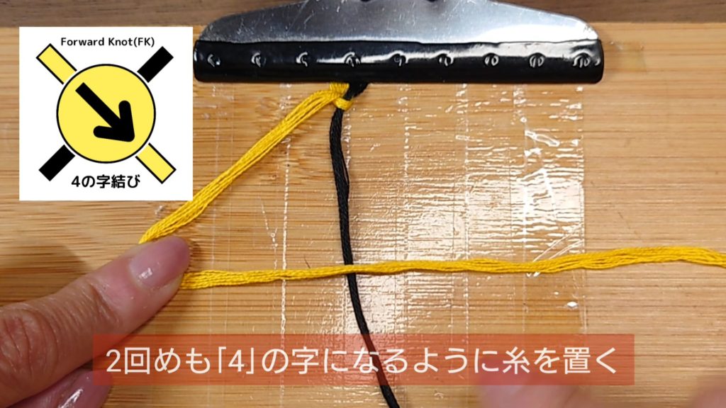 芯になる糸(黒)の上から下へ結び目を作る糸(黄色)を巻きつけ・・・